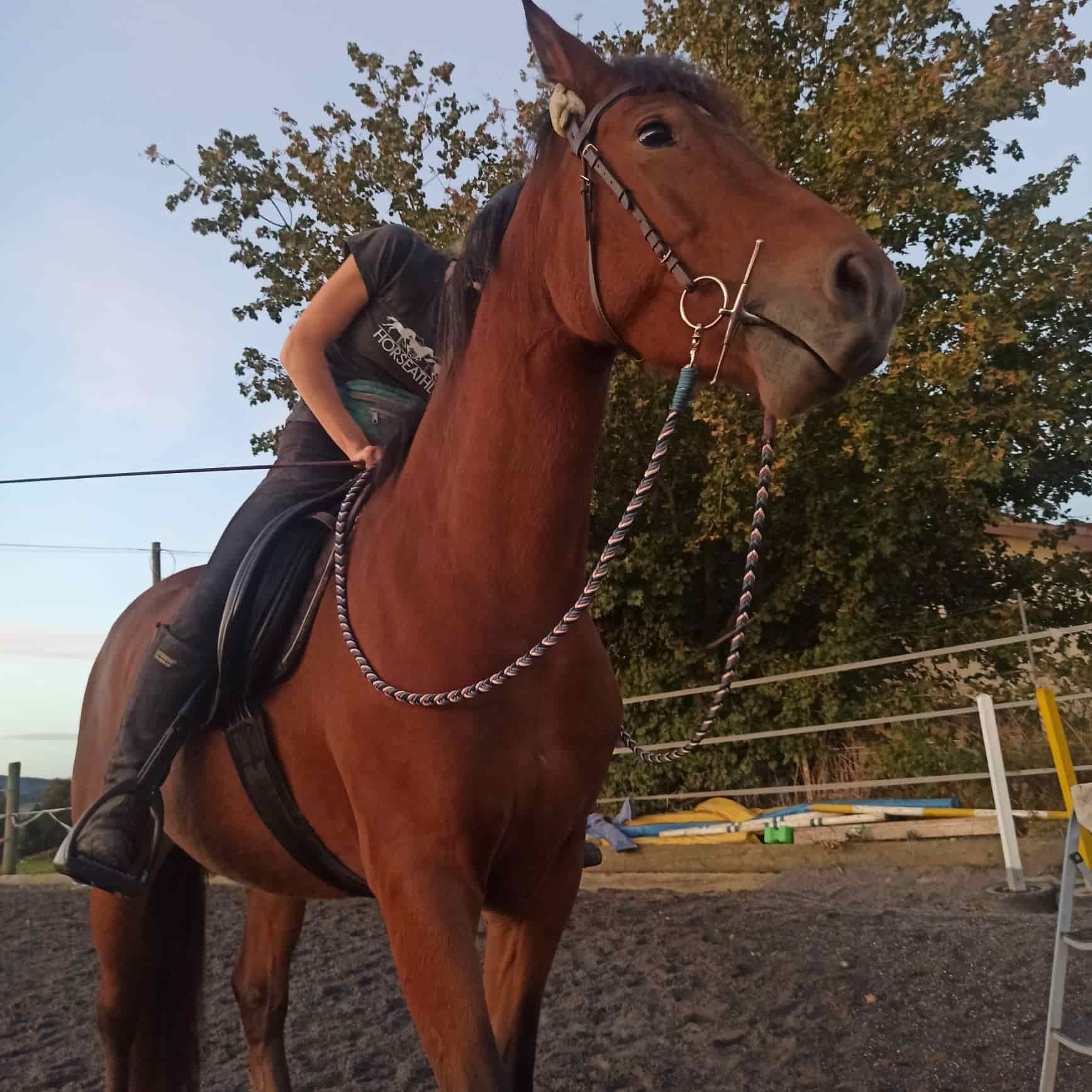 Ich habe 4 PP-Seile, je in der Länge von 10 m, gekauft und mit der Anleitung von Nordfalben angefangen zu flechten. Der Anfang war etwas schwer, denn wenn man kein Video, sondern nur ein Bild und ein wenig Text hat, war es nicht ganz einfach zu verstehen, wie das Flechtmuster funktioniert. Als ich nach eine Zeit dann herausgefunden habe, wie das funktioniert, habe ich mich daran gesetzt, um insgesamt 3 m Zügel zu flechten. Als ich ca. bei 2 m war, habe ich bemerkt, dass es nicht mehr so schön eng ist, egal, wie viel ich anziehe. Ich habe dann probiert, herauszufinden, weshalb das so ist. Ich habe dann gesehen, dass ich ca. in der Hälfte einen Fehler gemacht habe. Das war ein kleines Down in meiner Arbeit, habe mich aber trotzdem dazu entschlossen den noch einmal zu öffnen und es schön und sauberzumachen. Nach einiger Zeit Arbeit hatte ich meine 3 m und ich kam zum Schluss, was mich auch noch einmal vor eine Herausforderung stellte. Es war gar nicht so leicht, dieser Karabiner am Ende anzubringen.